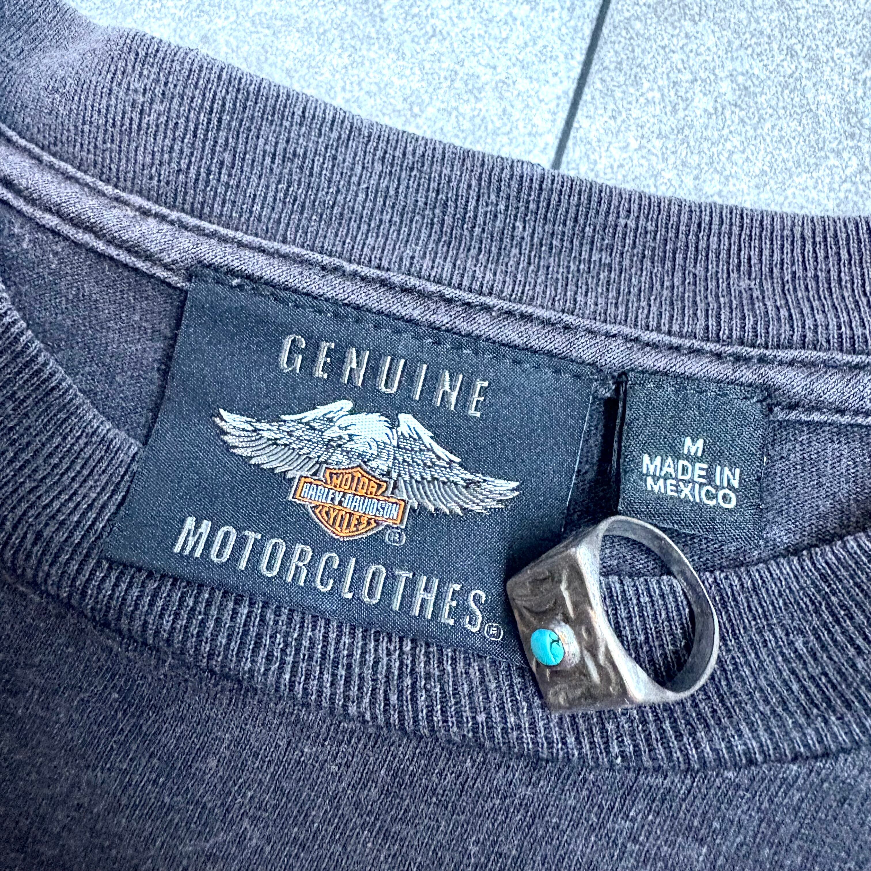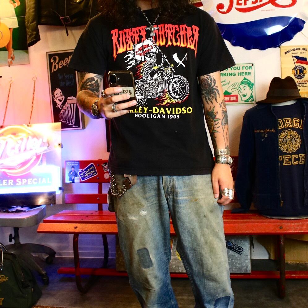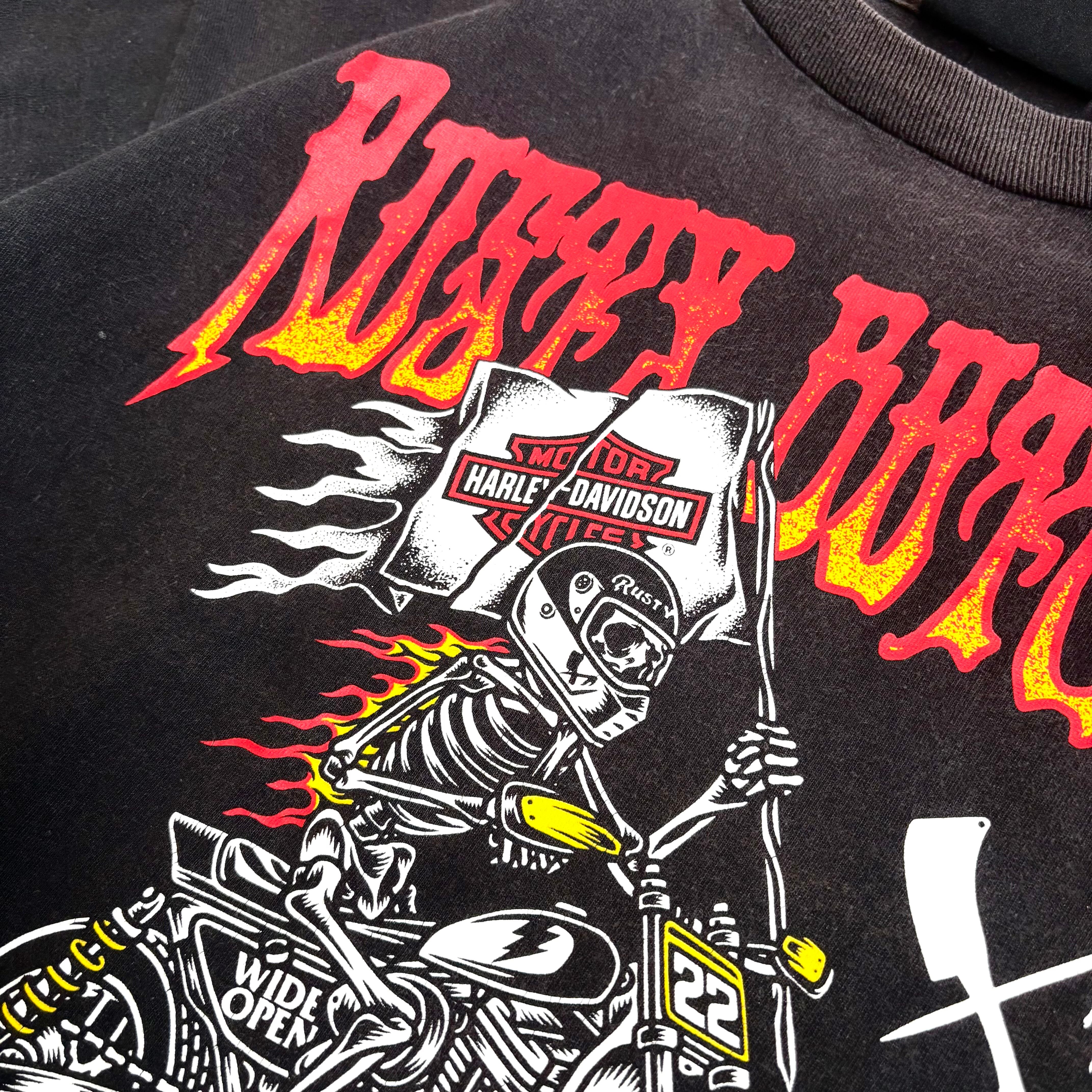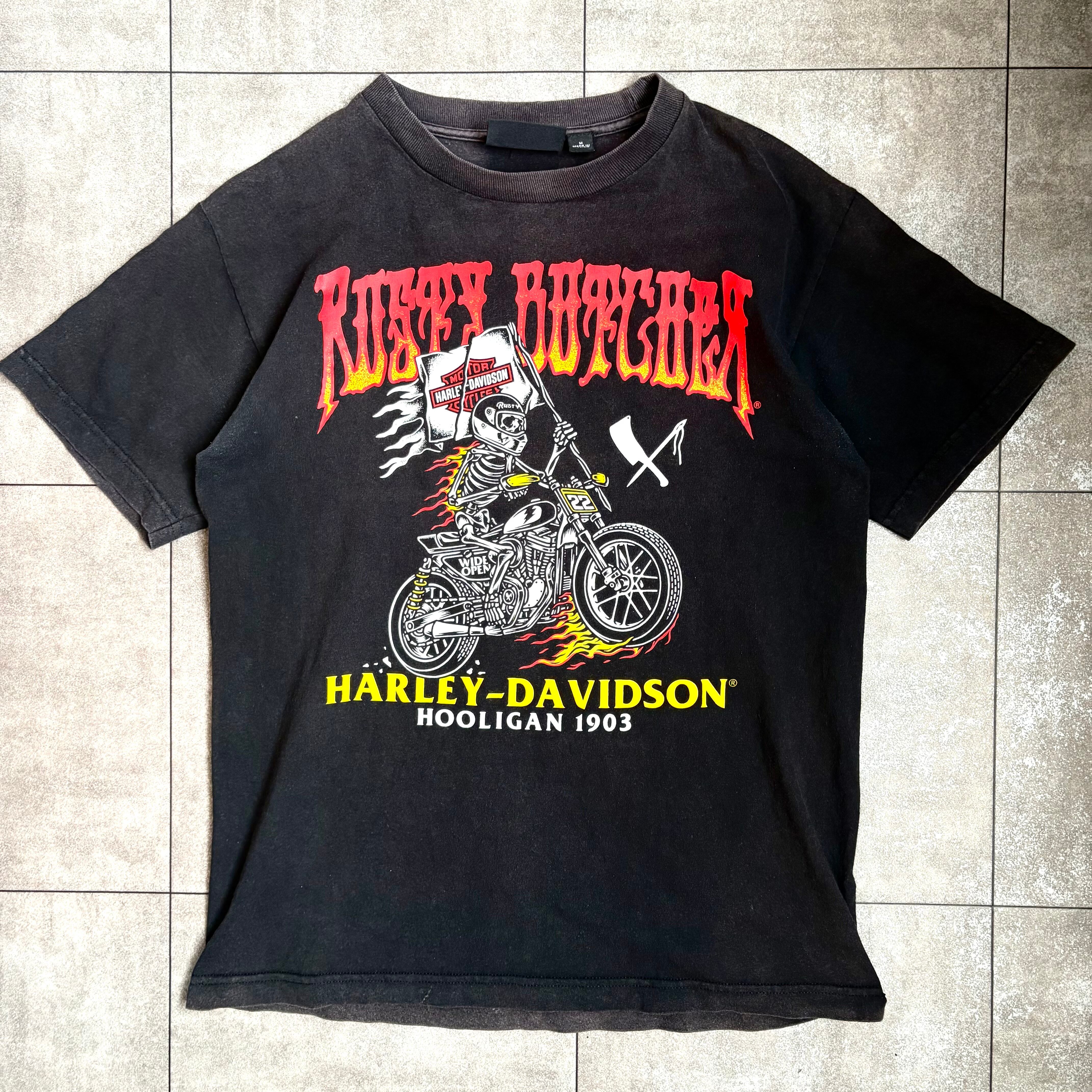 OLD "Harley-Davidson" bike×fire×skull print T-shirt